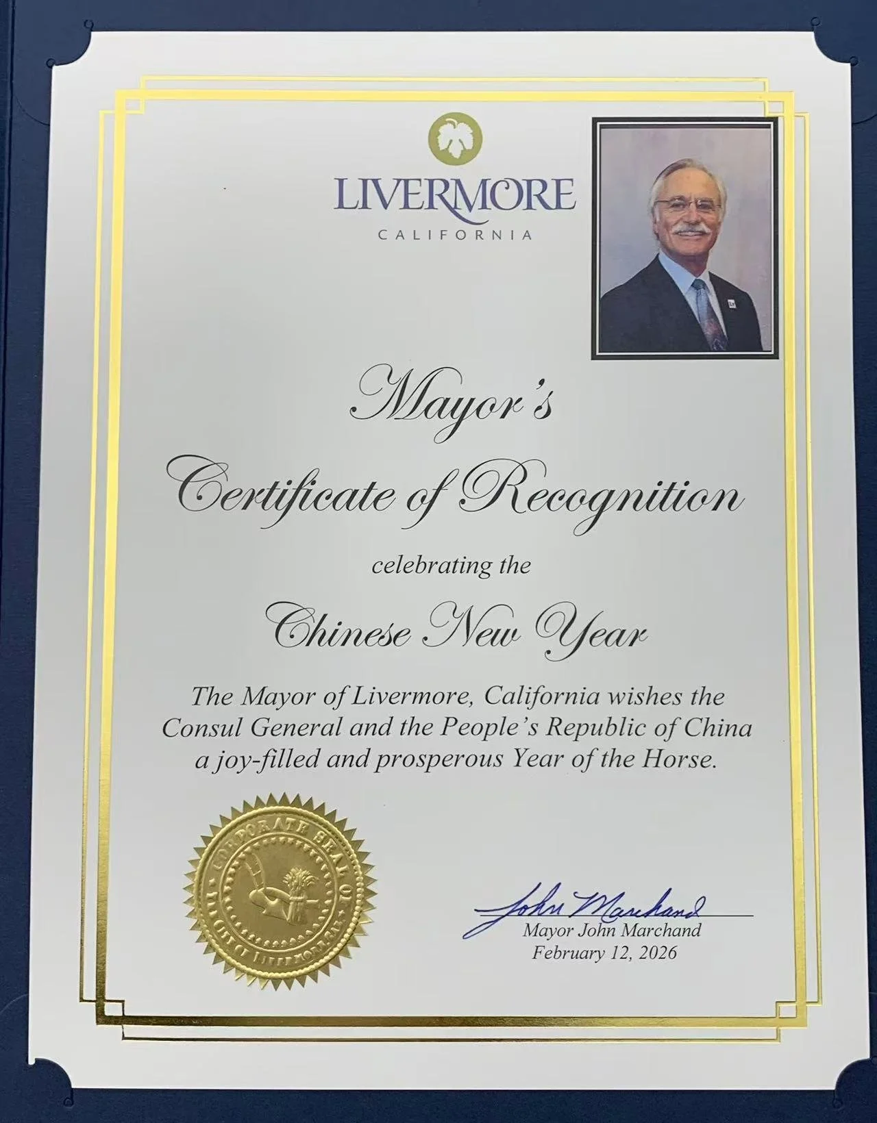 2026 年 2 月 12 日,美中硅谷协会主席Victor Wang)、会长兼硅谷摩根山市副市长Marilyn Librers、顾问兼硅谷利弗莫尔市市长John Marchand,受中国驻旧金山总领事张建敏及夫人邀请,出席了在总领馆举行的海外华侨华人新春招待会。美中硅谷协会顾问、利弗莫尔市市长约翰·马尚向张建敏总领事赠送了市长贺状,以庆祝中国新年。